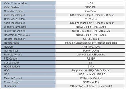 It comes complete with a 8-channel standalone DVRwith H.264 hardware compression, 8 economic 24 infrared LEDs cameras at 420 TV lines each, a 1TB hard drive, cables and power supply box.