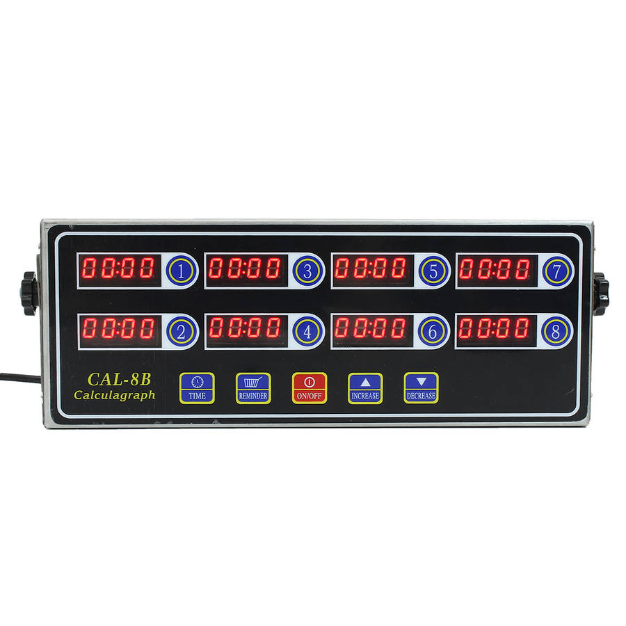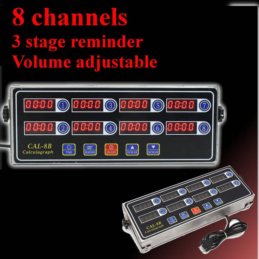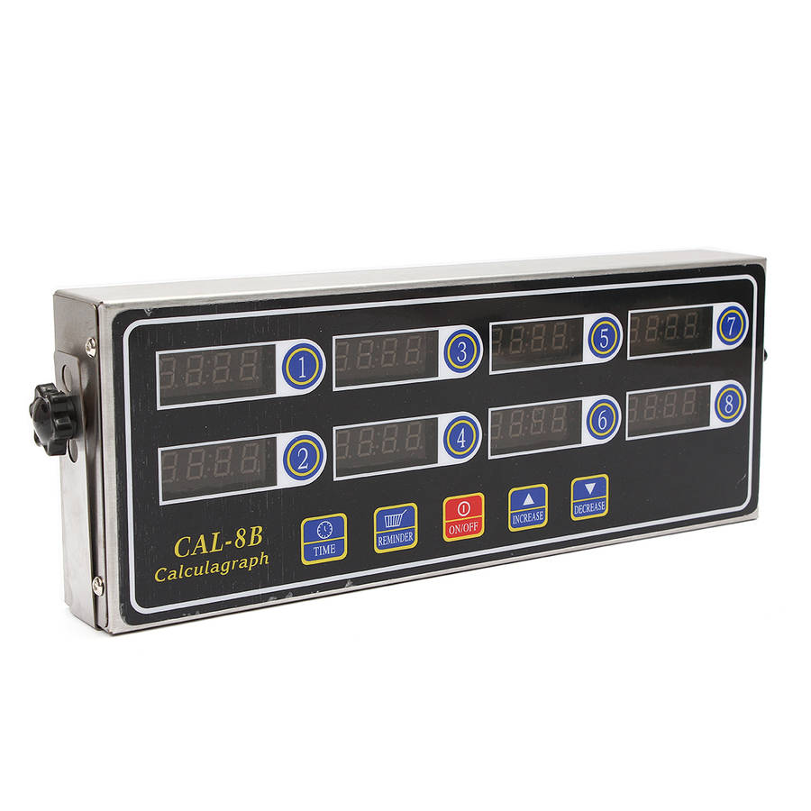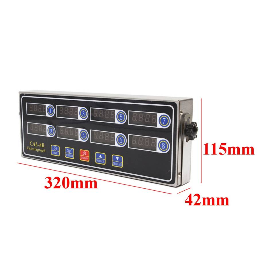 Description : 8 Channel Digital timer CAL-8B Burger basket shaking timing Kitchen Timers 220~240V stainless steel frame. 8 reminder function for each time window can be set independently of the total time, shaking basket segment timer has eight separate time display window, you can provide eight menus time time (middle prompt time), the time can range from 0 ~ 99 minutes and 59 seconds (0 to 99 hours 59 minutes) in any setting.
