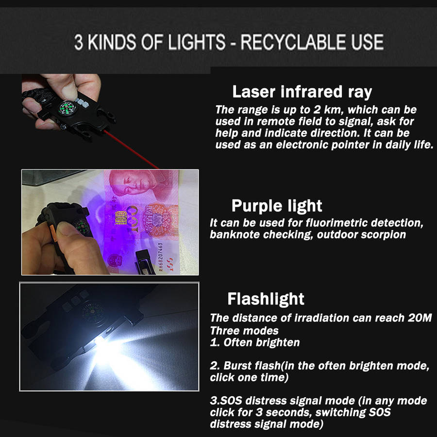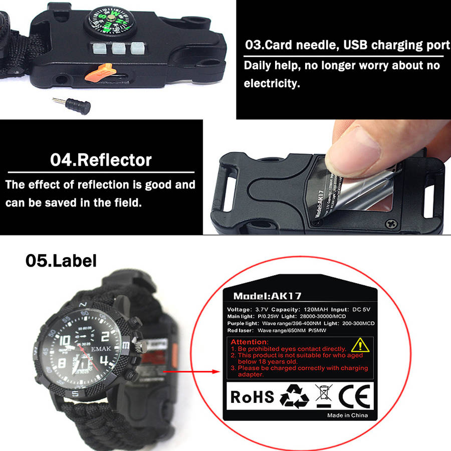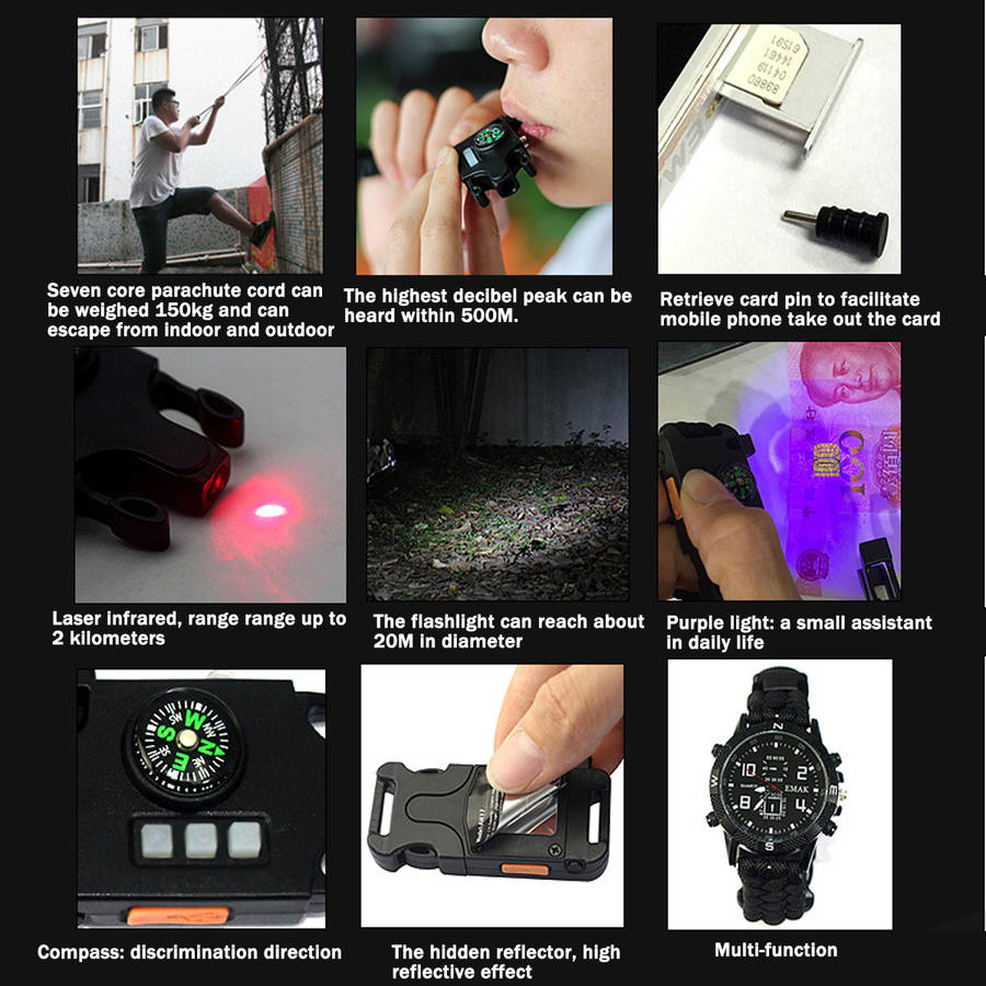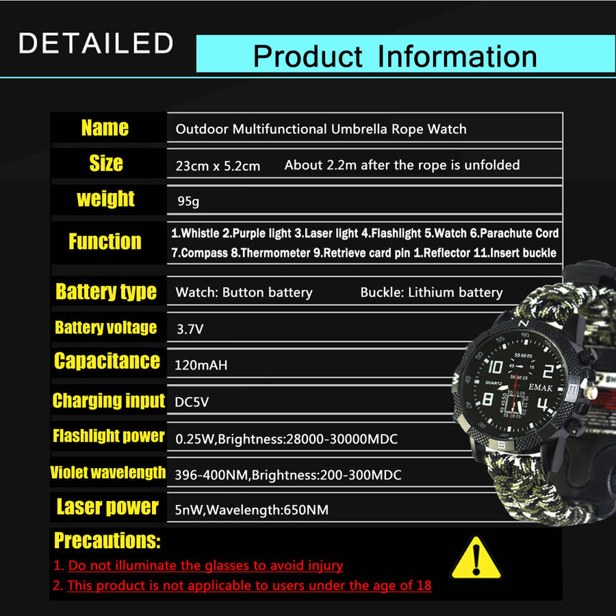 | Functions | Whistle, Purple light, Laser light, Flashlight, Watch, Parachute Cord, Compass, Thermometer, Retrieve card pin, Reflector, Insert buckle |