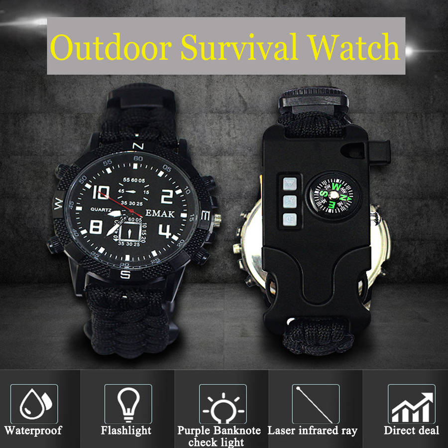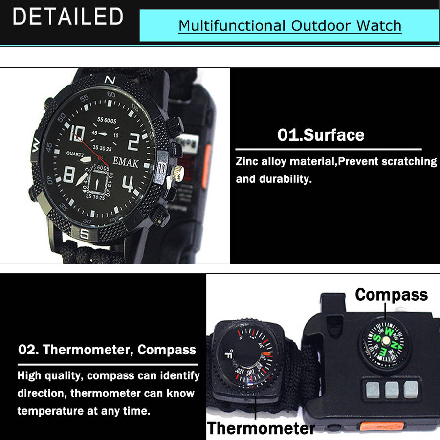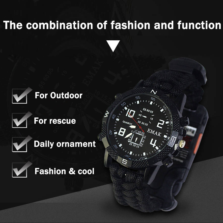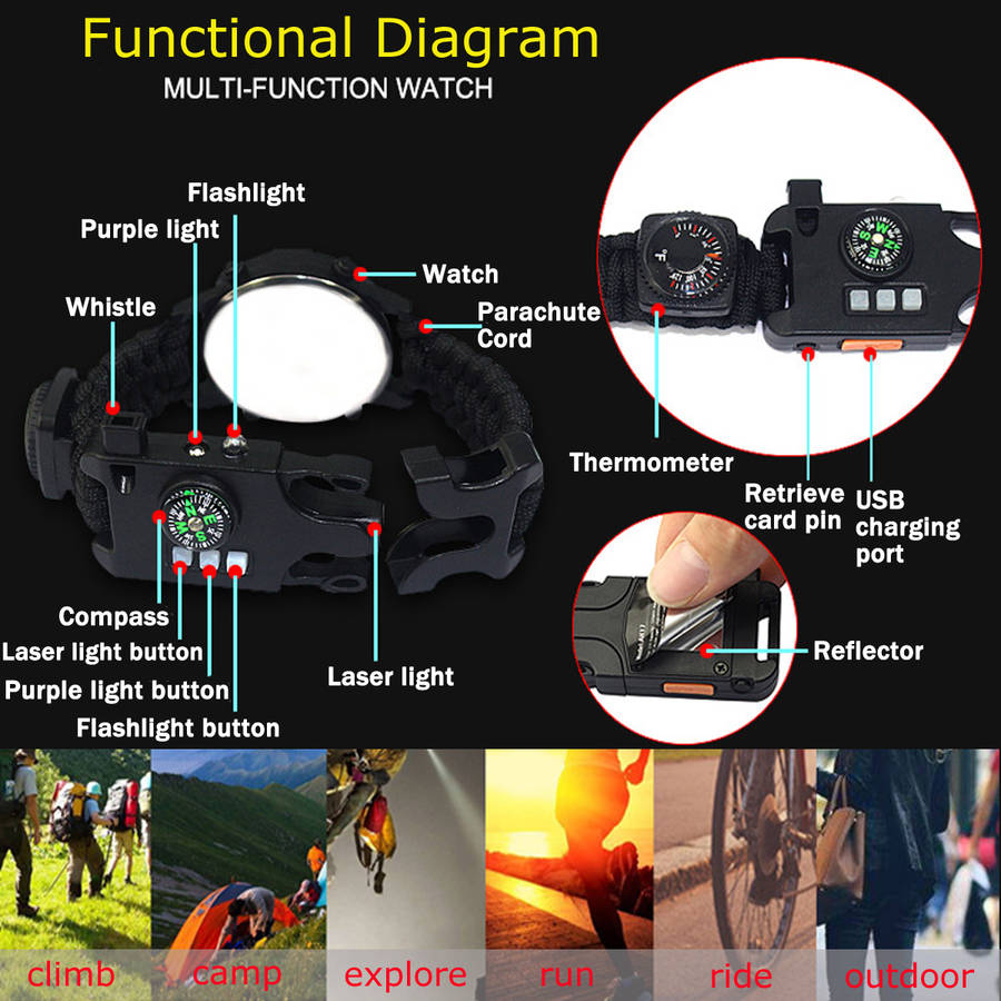| Functions | Whistle, Purple light, Laser light, Flashlight, Watch, Parachute Cord, Compass, Thermometer, Retrieve card pin, Reflector, Insert buckle |