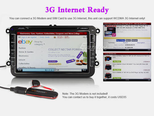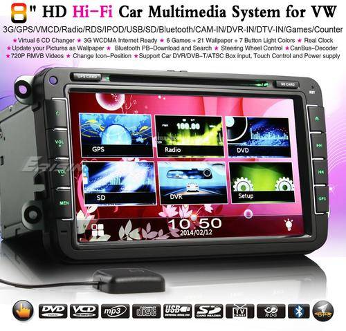 Size does matter! This unit is the latest 8 Inch unique Design for VW with Dual Channel Can-Bus-Decoder (it costs over R800), it has special Port for Car Recorder and DVB-T/ATSC Box. This item can power on the connected Car Recorder and DVB-T/ATSC Box. also it has built in the most popular and strongest function: HD Digital Touch Screen, fast response speed, 3G WCDMA Internet, Dual Zone, Steering Wheel Control, 720P RMVB (MP5), Virtual 6 CD Changer, Bluetooth PB-Download and Search, external Microphone Jack, built-in 6 Games, Calculator, 5 Start Unit Images, 7 Wallpapers, you can update your photos and setting it as wallpaper, Real Clock, change Icon-Position at will, support iPhone charge, Audio input and control, BT-Music play and control, Camera input, DVD/Radio/RDS/USB/SD.