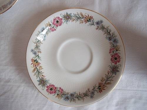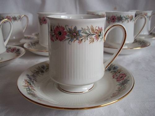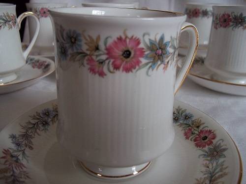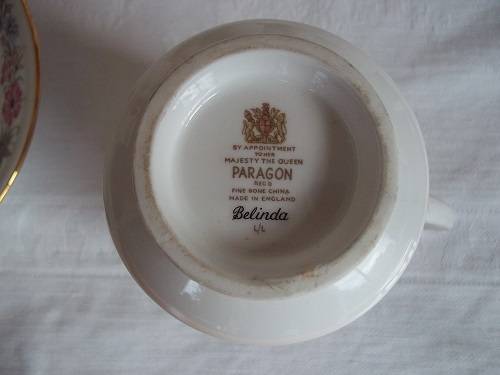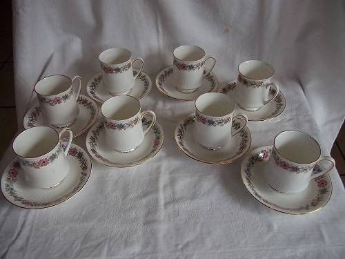 8 Lovely Paragon Belinda cup and saucer duos for 1 bid. This lovely set of 8 long elegant coffee cups and saucers is cream with floral decoration near the top rim - very much in the style of Royal Albert. They are backstamped "By appointment to Her Majesty the Queen, Paragon, Reg'D Fine bone China, Made in England, Belinda, L/L". The set is in excellent condition - no chips, cracks or repairs. Great buy for your breakfast table.