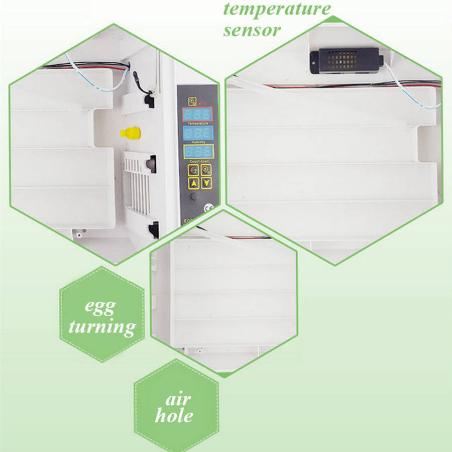 Features: Automatic flip egg function, high hatchability. Suitable for all kinds of poultry eggs hatch. Made of plastic material, portable and easy to operate. LED display panel with information including temperature, humidity, incubation days, egg-turning countdown, etc. With a transparent lid you can easily observe the incubation process without needing to open the unit. Humidity sensor, when the temperature and humidity within the box are outside the normal range, start automatic alarm.