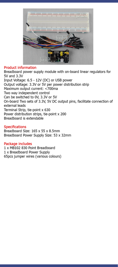 830 Tie Points Breadboard + 65pc Jumper Wires & Power Module Combo