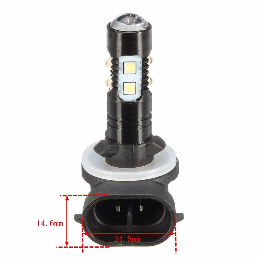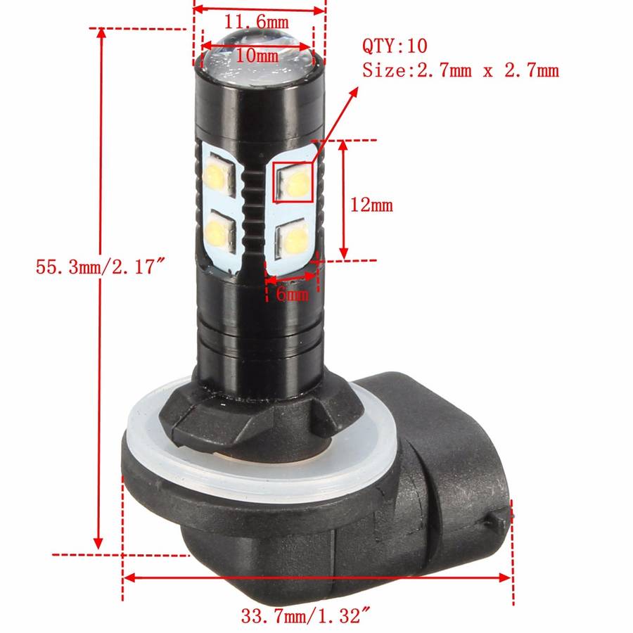 Specification: Light color:White Overall size(approx.):55.3mm/2.17”(H) Diameter:10mm LED size:2.7mm x 2.7mm (Detail size as shown in the picture) Rated voltage: DC 12V Wattage:50W Socket type:881,889 Light temperature:6000k LED Qty:10SMD LED Type: 5 W Chips
