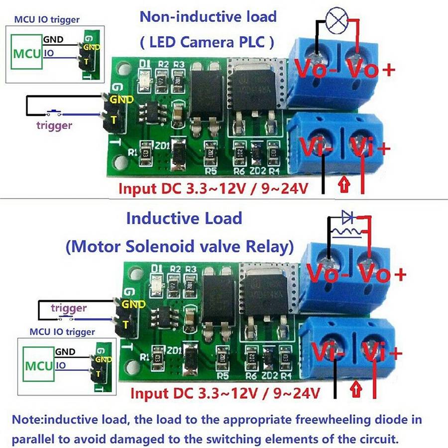Features: - Falling edge - triggered. Initial state after power no voltage output, once triggered, output terminal output the power supply votage, after once again trigger the output terminal no voltaged output, and so on. - Low standby power consumption, high output power,Optical Isolation. - Power supply voltage:9V-24V/3V-12V - Size: 36 x 17.5 x 14mm - Standby current:less than 0.11-1mA - Driver IC is N-channel MOSFET AOD4184,Maximum drive current is 8A Note: inductive load, the load to the appropriate freewheeling diode in parallel to avoid damaged to the switching elements of the circuit. Pin Description: Vi+:Power Input +; Vi- :Power Input -; Vo+:Power Output +; Vo- :Power Output -; G:trigger signal input ground; T:trigger signal input terminal(0.2-2 second low pulse trigger). Applications: Self-locking electronic switch ARM MCU Development Board Motor/Relay /Solenoid valve IP PTZ camera esp8266 WIFI Router MODULE 315M 433M Wireless remote controller PLC MODBUS Device Package Included: 1 x 8A Flip-Flop Latch Switch Module