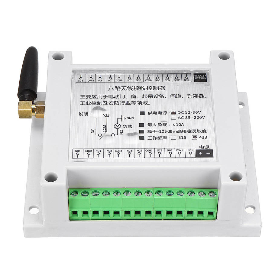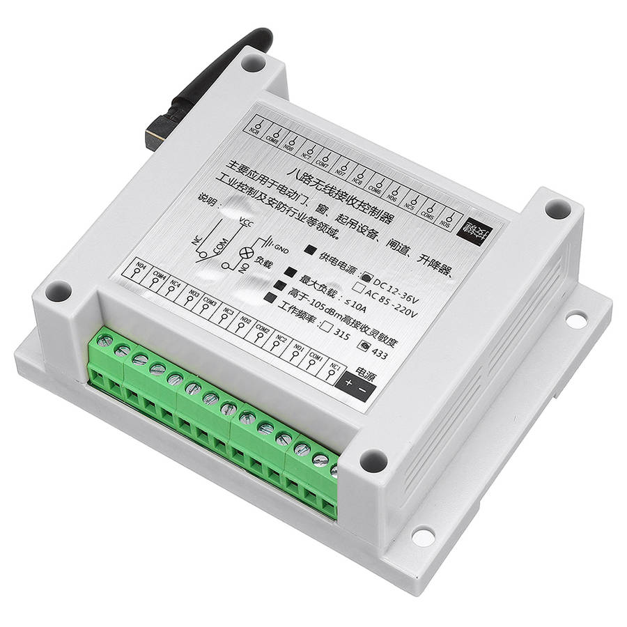 The new learning code 8-way remote control switch is upgraded on the basis of the old model, and adopts exquisite industrial control shell design in appearance, and the style is more high-end. The terminal is upgraded. When the interference is strong, the suction cup antenna and the high-sensitivity receiving module can be connected to enhance the signal receiving ability. Another buzzer prompt function. There is no need to use traditional jumpers or DIP switch coding, just let the receiving controller receive and store the wireless signal transmitted by the remote control, and then the supporting use can be realized. If the learned remote control is lost during use, you only need to clear the information stored in the receiving controller. The lost remote control will not be able to remotely control the receiving controller. If you want to regain the right to use, the owner must regain the right to use it. Re-learn it before use. There are 6 switchable output modes. Mainly used in electric doors, windows, lifting equipment, gateways, elevators, industrial control and security industries and other fields.