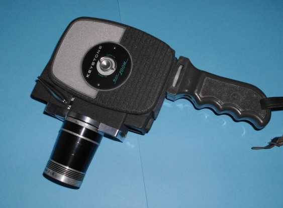 Hanimette Strip film projector and films - in a good working condition as well as a Keystone Zoom, Electric eye, K-7 8mm camera. The camera bag is somewhat worn and the leather straps are broken. The handle winds up a spring and the camera makes a ticking noise when a knob is pressed.