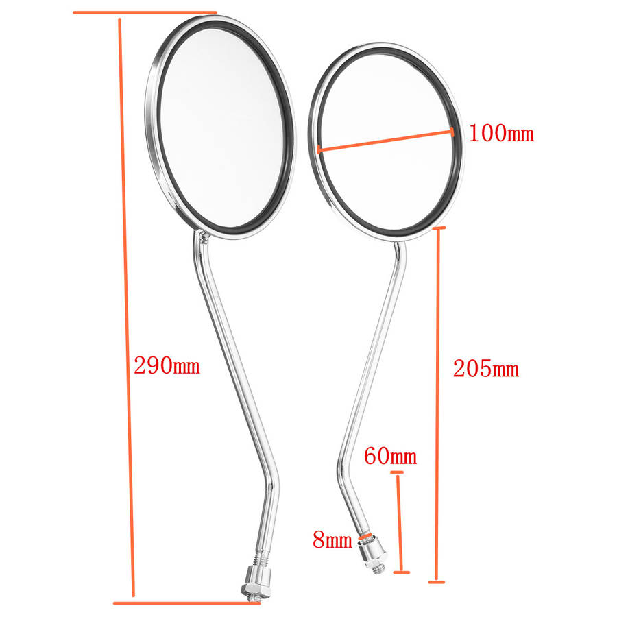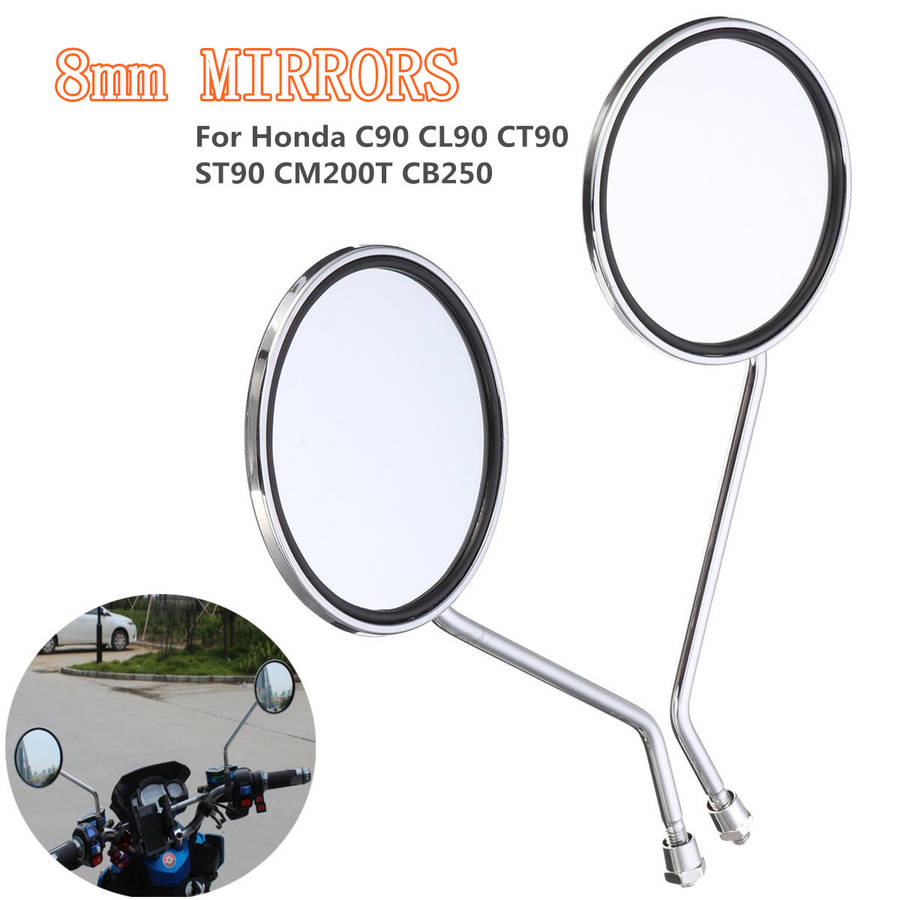 Description: Mirrors Will Only Fit On R/H Threaded Mounts. Will Not Work If Mounts Have Reverse Threads. Also Fit for Yamaha/Kawasaki And Other Imports With 8mm R/H Mounts. Specification: Product Name: Motorcycle Rearview Mirrors Color: Black Frame with Chrome Stem Material: Metal Placement on Vehicle: Front Mirror Diameter: 4'' Thread Size: 8mm Works on: Cafe Racer Custom Chopper Scooter Motorcycle Fitment: For HONDA C90 CL90 CT90 ST90 CM185 CM200T CB250 Note: 1. We provide clear pictures, measurements where possible. Please check as much as possible to make sure the item is the one that you need. 2. Please allow 0.5-1 inch difference due to manual measurement.(1inch=2.54cm) 3. Instruction is not included,professional installation is highly recommended. 4.(The compatibility is just for reference. Please compare the part No.with your original one before purchasing!) Package Included: 1 X Pair Motorcycle Rearview Mirrors (Left & Right)