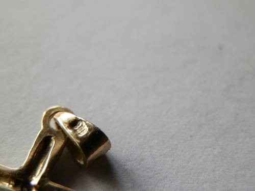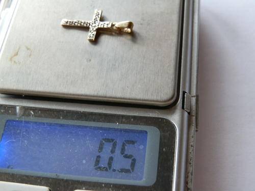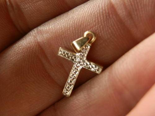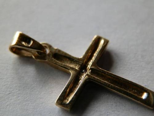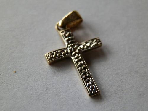 Pretty 9 ct yellow gold and diamond cross pendant, marked and in good condition. The size of the pendant is 2(1.8) x 1.2 cm and weighs 0.5 g. The size of the diamond is about 1 mm diameter.