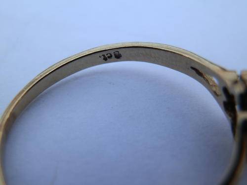 Sweet 9 ct gold diamond ring, marked 9 ct, in good condition, size T / 10 with a head width of 7 mm and weight 2.1 g. The size of the diamond is about 1 mm diameter.