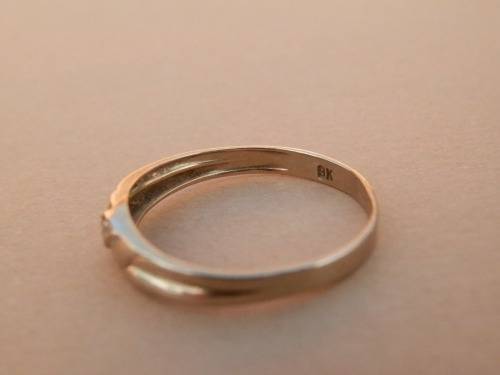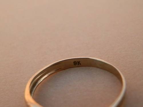 9 ct Yellow gold diamond ring, marked 9 K and in good condition. The size is H / 4, top width 4 mm and the weight 0.5 g. The size of the diamond is approx 0.5 mm diameter.