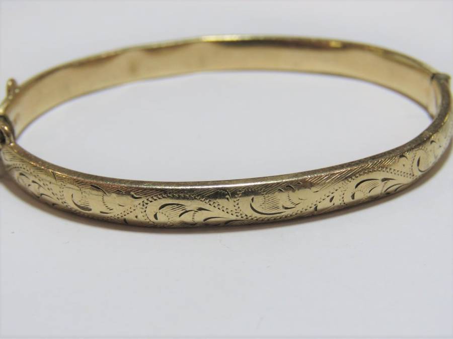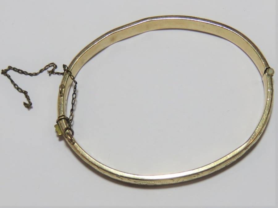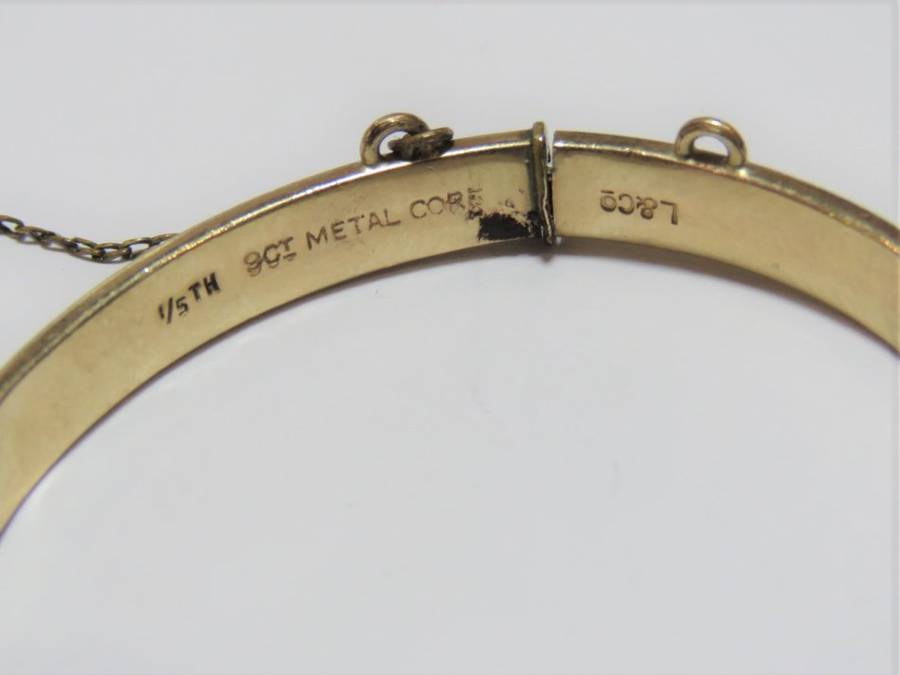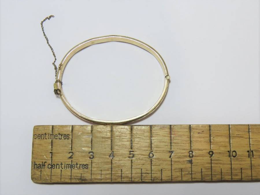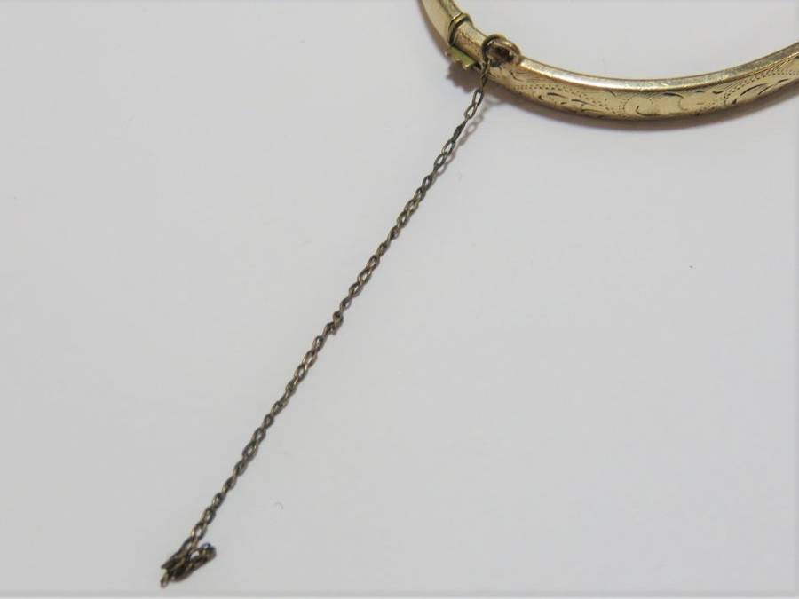 9+kt Gold Metal Core bangle with safety chain - Chain is loose - Some dents inside - Weighs 6.0 gram