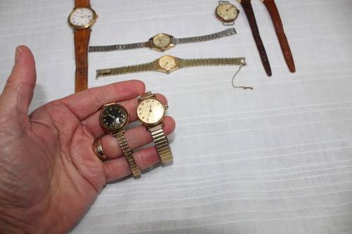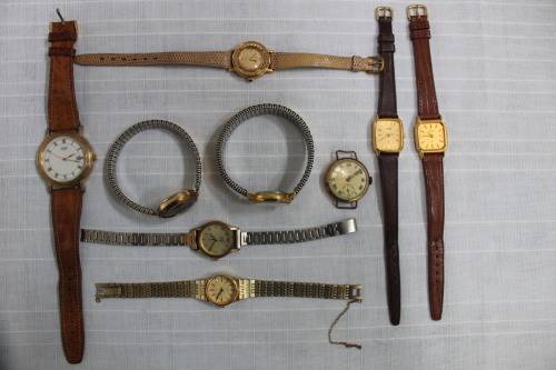 The watches are : 4 x Citizen (2 look very new - probably need batteries), 1 x Bentley, 1 x Seiko, 1 x Union Special, 1 x De-Coven and the really old one is a Cyma
