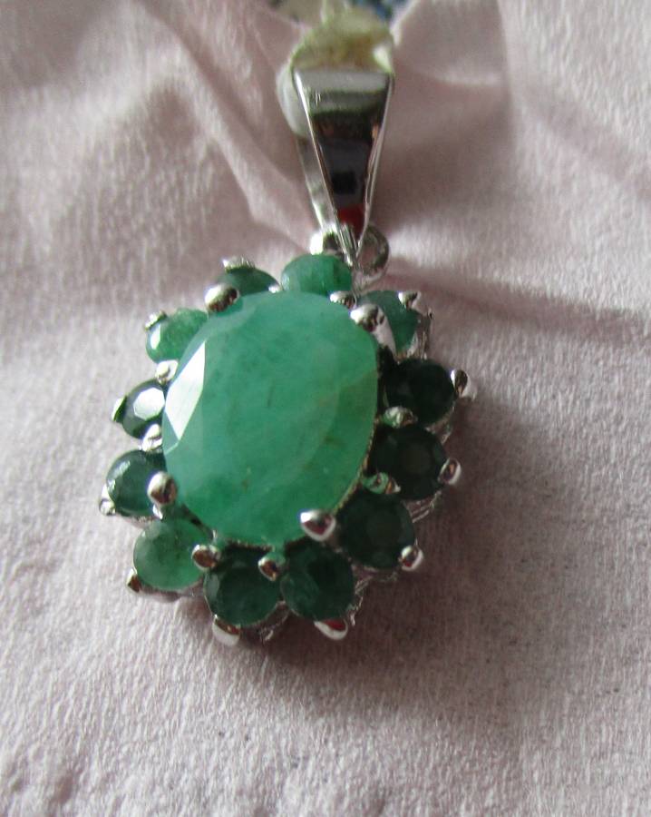 This sterling silver pendant is colet set with one piece of 9.00 x 7.00 mm oval cut emerald and surrounded by 12 pieces of 2.00 mm round cut emeralds, total carat weight -+ 2.03 ct., natural stones, green colour.