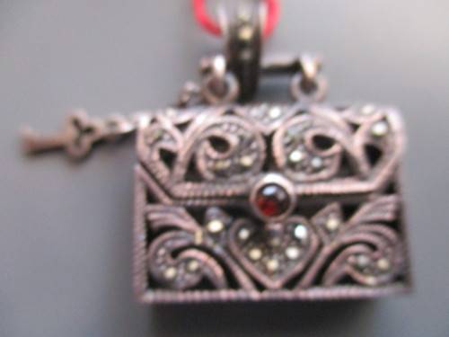 Gorgeous 925 sterling silver purse- pendant. Each piece is a unique piece of art. Crafted in solid sterling silver, this pendant / with one 3.00mm garnet and key das open see photo is just waiting to find a home on your vanity