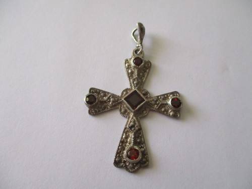 A 925 sterling silver pendant cross set with ; 1 pieces 5.00 x 5.00 mm square faceted cut garnet and 4 pieces of 3.00 mm round garnets. .