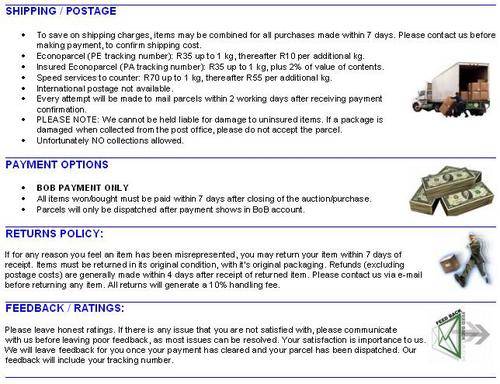 R65.00 Standard shipping applies to orders under R100.00, in most areas in South Africa. R35.00 Standard shipping applies to orders over R100.00. Some areas may attract a surcharge surcharge. This will be calculated at checkout if applicable.