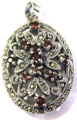 A nice oval shape sterling silver pendant , stamped 925 and set with 11 pieces of 3.00 mm round cut garnets and small round marcasite. The Pendant measures 4.20 cm x 2.60 cm and weight 12.33 grams.