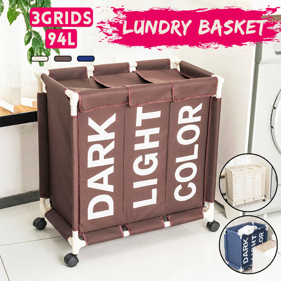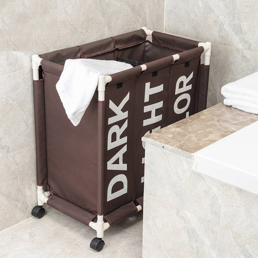 Description: 94L Storage Basket Sundries Multi-compartment Laundry Roller Basket Organizer Specification: Color: Beige / Brown / Blue Materials: Oxford cloth Capacity: 94L Grids: 3 Size: 62x35x66cm Feature: - Removable roller storage basket for easy mobility and capacity. - Multi-compartment designs, classifying and placing dirty laundry, to prevent cross-infection. - Clear print, even line, tight and durable. Installation: 1. Insert the plastic tube into the connecting elbow. 2. Insert 4 rollers into the elbow to connect the bottom. 3. Put the Oxford cloth into the plastic tube holder and stick the buckle. Package Included: 1 x Laundry Basket More Details: