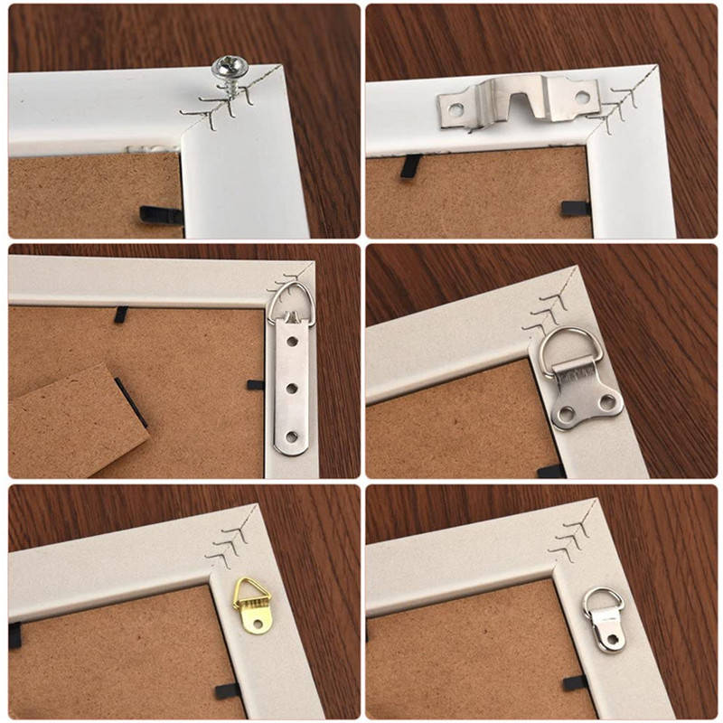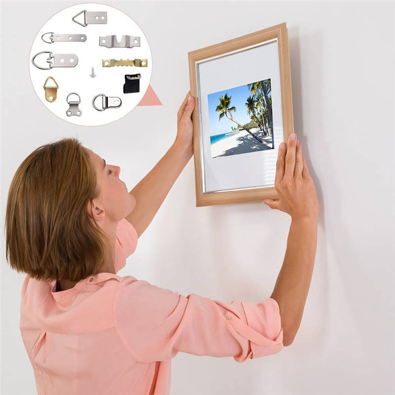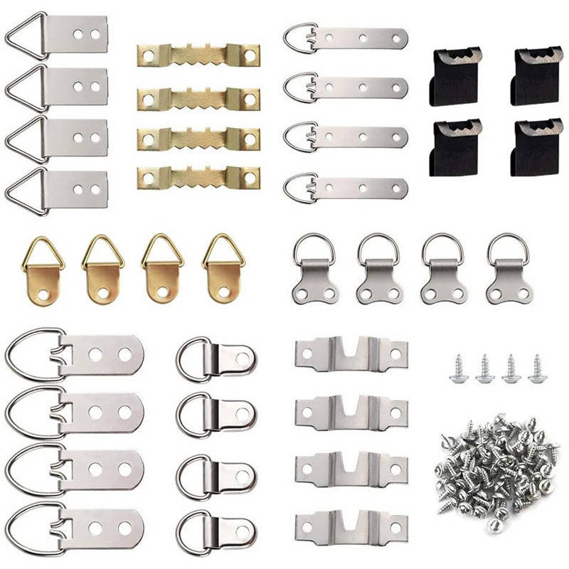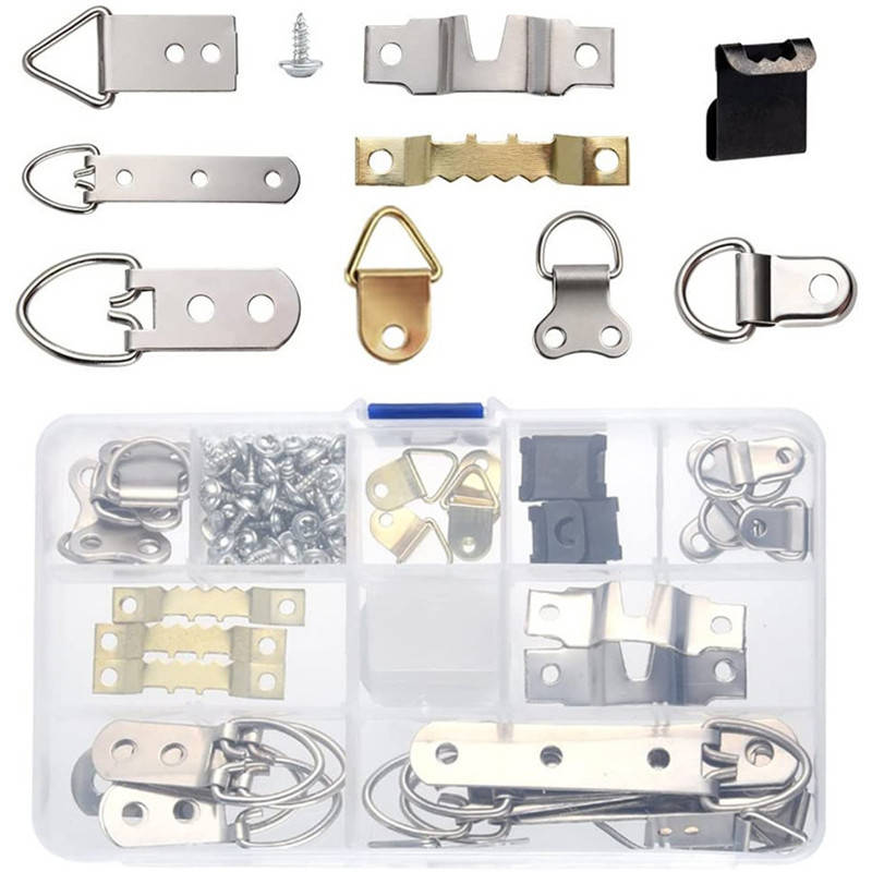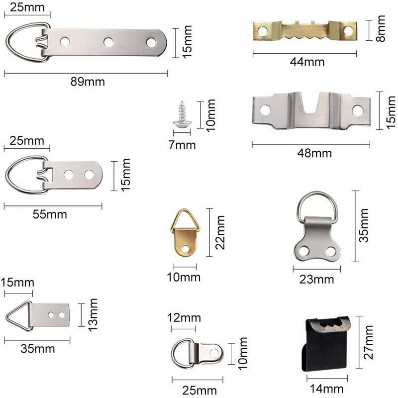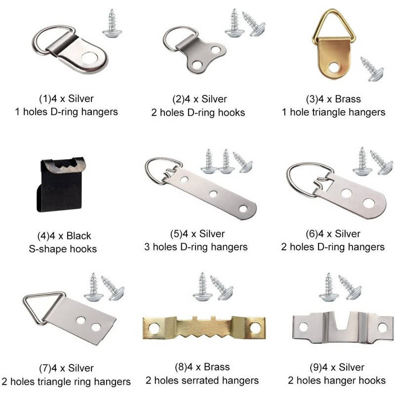 Specification: Color: Silver, brass, black Material: Brass,stainless steel and metal Feature: 1.Multi style kit: includes 9 models of picture hangers,4 pieces each model and with 60 pieces supplementary screws,96 pieces in totally 2.Practical and reusable plastic box for easy storage,small kits collect neatly 3.Widely use:versatile painting hangers in size and type to meet your need to hang up picture frame,cross-stitch,artwork,framed maps,framed postcards,paintings in home,office,school etc. Package Included: 4 x Silver 2 holes hanger hooks 4 x Silver 1 holes d-ring picture hangers 4 x Silver 2 holes d-ring picture hangers 4 x Brass 1 hole triangle ring picture hangers 4 x Brass 2 holes serrated picture hangers 4 x Stainless steel 3 holes d-ring picture hangers 4 x Stainless steel 2 holes d-ring picture hangers 4 x Stainless steel 2 holes triangle ring picture hangers 4 x Black S shape frame hanging hooks 60 x Screws 1 x Plastic box More Details: