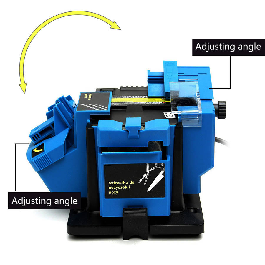 Specification: Color: Blue + Black Voltage: 220V -240V, AC 50HZ Power: 96W No-load speed: 1350 rpm The largest wheel diameter: 56mm/2.20`` Drill bit size: 3-13mm/0.12``-0.51`` Can be sharpening width: 6-51mm/0.24``-2.01``, width limit removable width unlimited Head angle adjustable: 15-50 ᆪ with a strong magnet adsorption Size: Approx. 14x16x14.5cm/5.51x6.30x5.71`` Versatile and easy to use, compact and easy to carry. This sharpener tool includes three working modules: HSS drill sharpener - Sharpens all high speed steel drill bits from 3mm to 13mm. Cut Machine and Scissor Sharpener - Sharpens all straight edged knife & scissors. Chisel and plane sharpener - Regrinds chisel and plane blades from 6mm to 51mm wide. Packing Included: 1 x Electric Multifunctional Sharpener More Details: