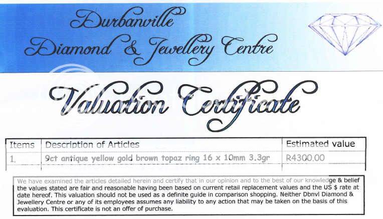 This beautiful gold ring has been valuated at R4300 by the Durbanville Diamond & Jewellery Centre as per the following certificate ...