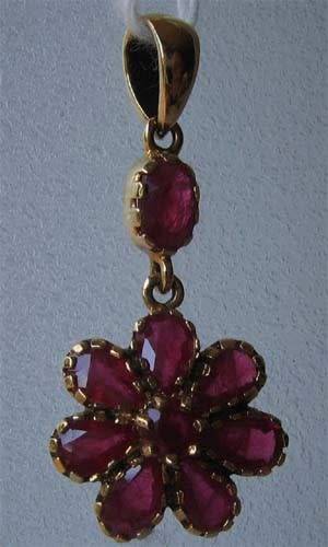 9ct yellow gold and genuine rubies style pendant - [ it is solid gold not plaited] IS SET WITH :1 piece 5.00 X 3.00 MM OVAL FACETED RUBY 7 PIECES 5.00 X 3.00 mm PEAR CUT RUBIES &1 PIECE 3.00MM ROUND CUT RUBY, TOP QUALITY STONES, WEIGHT approx. + 1.18 CT. THE Pendant, MEASURES approx; 2.80 cm long x 1.20 cm wide. Please don't bid if you don't want the item & No refunds for change of mind