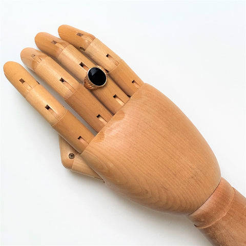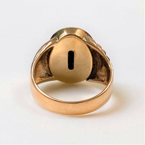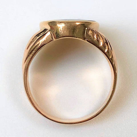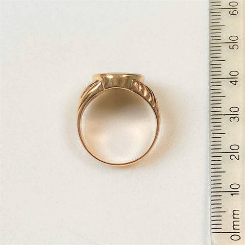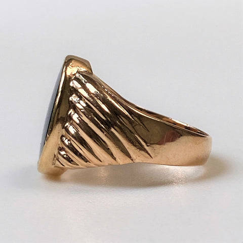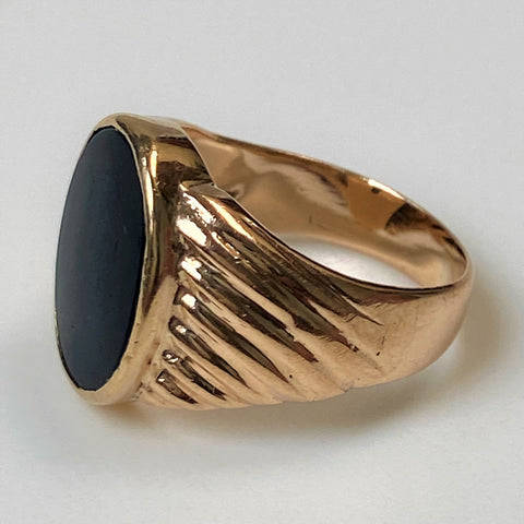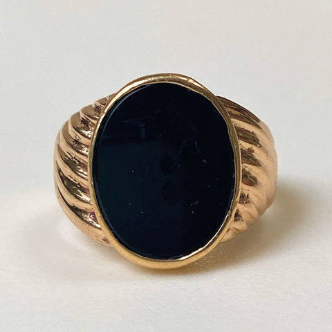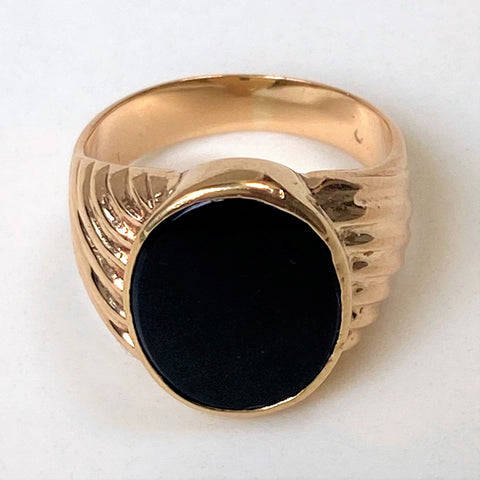The vintage 9ct yellow gold mens signet ring is set with an oval polished black onyx (14.9mm x 11.8mm). The ring has ribbed decoration on the shoulders. The ring has rubbed marks which could read K 9. The ring has been tested to be 9ct yellow gold.