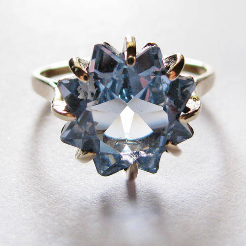 This stunning antique, 9ct gold ring features an unusual star-cut natural aquamarine that measures a whopping 12mm in diameter. The inside of the ring is hallmarked and measures 18mm in diameter. The ring weighs 3.5g in total (including gem) and has recently been restored and appraised.