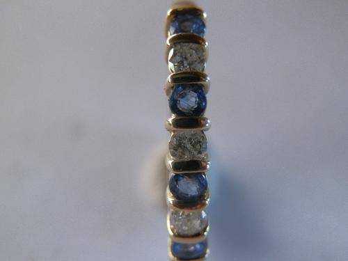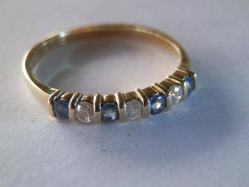 A nice diamond and blue sapphire 9ct gold eternity ring, in new condition.