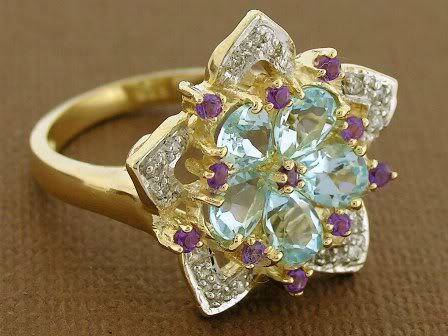 BEAUTIFUL, 9ct Solid Gold NATURAL Diamond, Topaz & Amethyst Blossom Cluster Ring