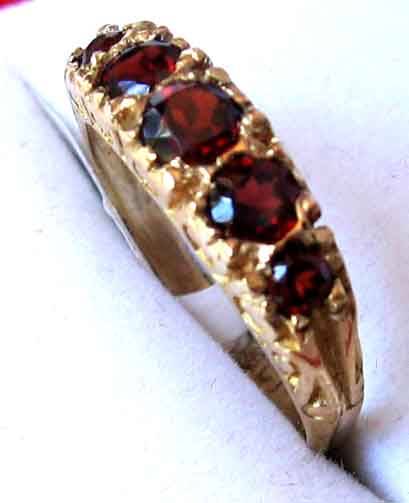 9ct solid gold, set with 5 pieces , round faceted cut genuine garnets, antique style -new ring. The ring is size '' N'' , 7 , weight 2.30 grams. Lovely piece , a good price.. Thanks for viewing.