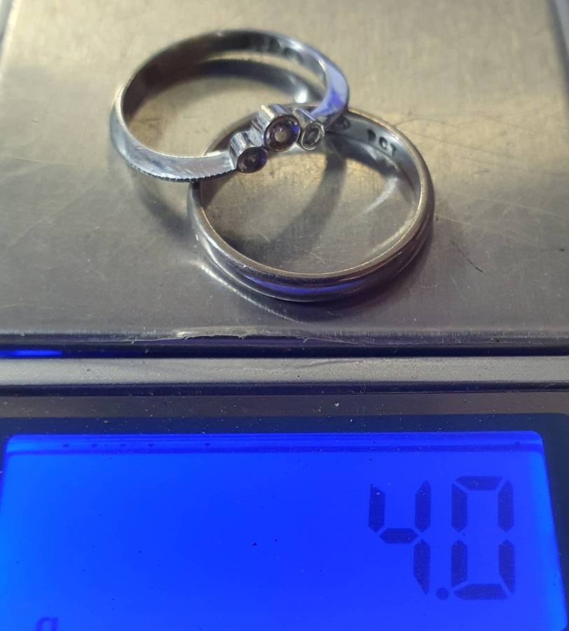 DESCRIPTION: 9ct WHITE GOLD CURVED "V" RING WITH MILGRAINED KNIFE EDGE SHANK AND 3 TUBE SET DIAMONDS IN CENTER. 1 X 0.04ct RBC/G-H/VS-SI DIAMOND & 2 X 0.015NRBC/G-H/VS-SI DIAMONDS.TOTAL WEIGHT OF BOTH RINGS :4.00g. SIZE: 17.30mm/ 7