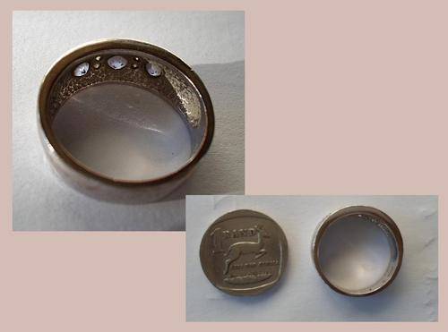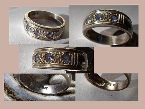 ATTRACTIVE 9CT WHITE GOLD TANZANITE & DIAMOND RING EX NWJ (NATAL WHOLESALE JEWELLERS) 3 ROUND STRONG VIOLET TANZANITE STONES WITH BLUE TINGES, FLANKED WITH 4 X 1MM DIAMONDS. EXCELLENT CONDITION, NO VISIBLE FLAWS OR IMPERFECTIONS NOTED. 18 MM INSIDE RING DIAM. BAND MEASURES APPROX 4 TO 7 MM WIDE, I MM TO 2 MM THICK. TOTAL WEIGHT APPROXIMATELY 4.4 GRMS.