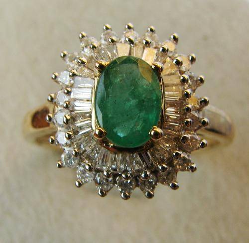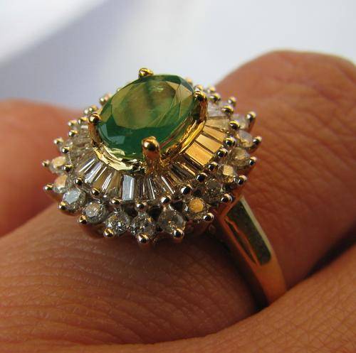 9ct yellow gold real .80 carat emerald and .55 carat baguette diamond ring.