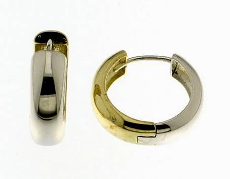A pair of hinged huggie hoop earrings: 4.5mm wide, 15mm in diameter, polished 2 tone, on clips.
