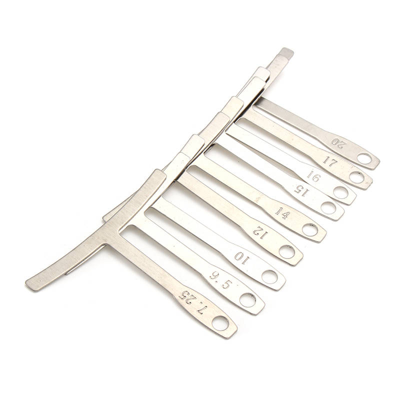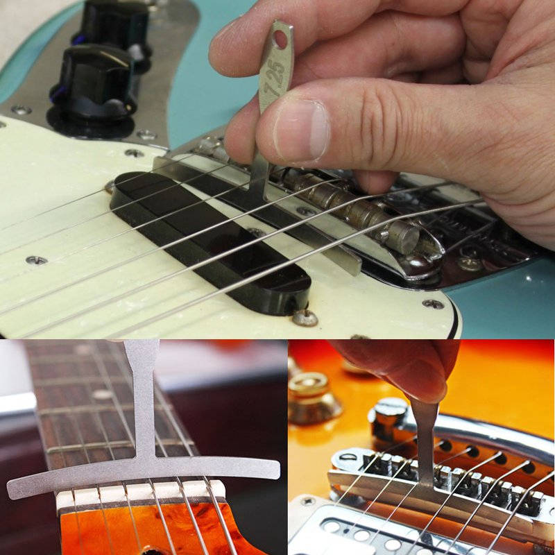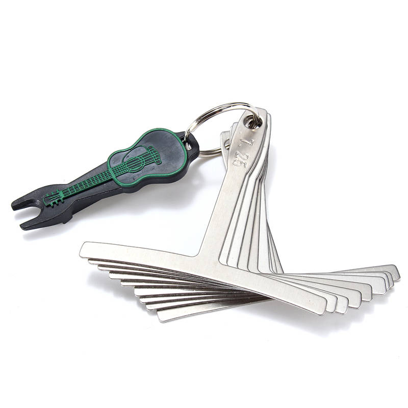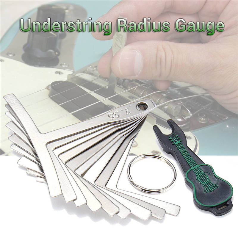 Feature Understring radius gauge Set of 9:7.25”,9.5”,10”,12”,14”,15”,16”,17”and 20” Laser cut from stainless steel Etched with radius on handle (1mm) thick,(69mm) wide,(64mm)length These come in the most popular fingerboard radius and make it easy to measure the radius from either above or below the strings. Use these to accurately setup your guitar bridge saddles to match the fingerboard radius. Quantity:1Set(9pcs,Not include the guitar )