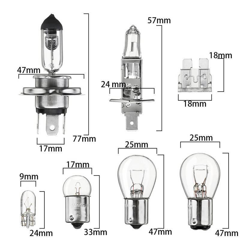 Package Included: 1 X H1 12V55W P14.5S 1 X H7 12V55W PX26D 1 X 1156 P21W S25 12V21W BA15S 1 X 1157 P21/5W S25 12V21/5W BAY15D 1 X G18 12V10W BA15S 1 X T10 12V5W 1 X ATC FUSE 10A 1 X ATC FUSE 15A 1 X ATC FUSE 20A