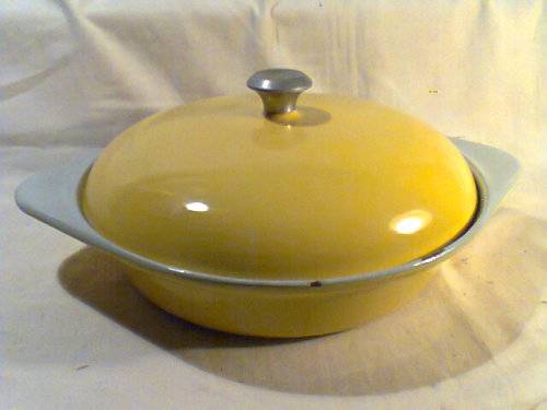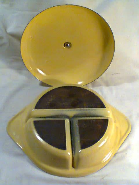 A real beautiful example of a Vintage Cast Iron & Enamel 3 division serving Lidded Pot. In good used second hand condition. Size: 320mm Wide x 250mm across.