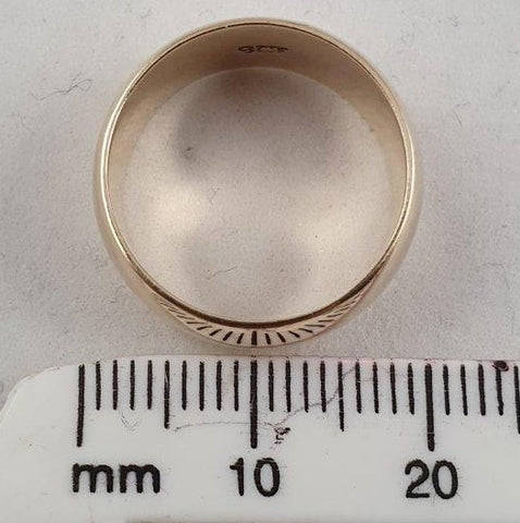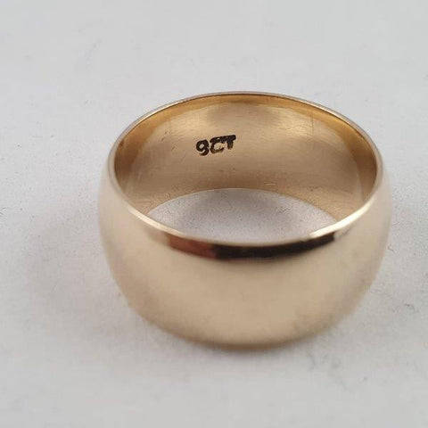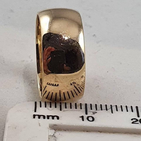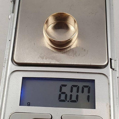 This classic 9ct gold broad band unisex ring weighs 6.07 grams and is in good in condition. The ring is 1cm broad and around 2cm across. It is stamped 9ct gold. Please view the pics as they form part of the description.