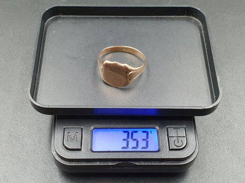 This engraved signet ring is perfect as a gift or for oneself, this traditional signet ring in 9ct gold is the hallmark of sophistication. Initially recognized as symbol of family heritage, the signet ring still represents class and style. The ring is a size T and weighs 3.53 grams. The engraving on the front has faded slightly. The ring is stamped 9ct.