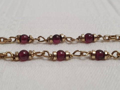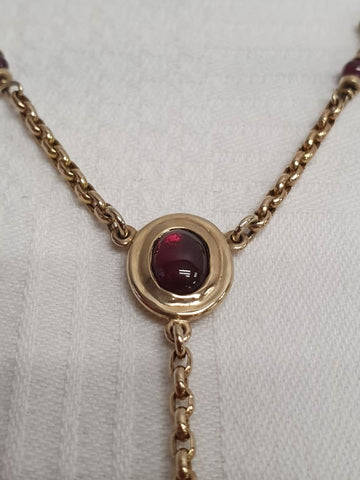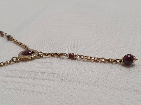 This stunning and beautifully made 9ct gold ladies necklace with an array of garnet stones is in stunning condition and measures 26cm long closed. The necklace weighs 9.2g. This stunning necklace would look just as good with an evening gown or formal outfit as it would with a pair of jeans and collared shirt. The necklace would also make a stunning valentines gift for a special lady. Please view the pics carefully to fully appreciate this beautiful and very elegant gold and garnet necklace and to confirm the condition.
