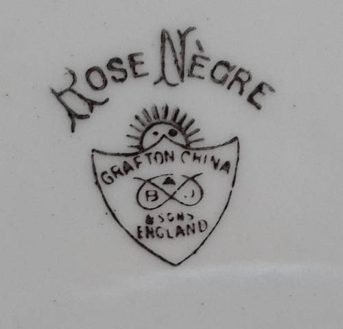 An antique trio by A.B. Jones and Sons, which operated from the Grafton Works in Longton, Stoke-on-Trent. This trio, remarkably, dates from the early years of the factory: the back stamp was in use only between 1900 and 1913, making this trio a true antique! Each piece features a broad band of pink roses towards the edge, followed by a narrower band with pink and light purple flowers against a black and white background. Thus the name of this pattern: ‘Rose Negre’ (Black Rose), probably also because in the broad band the leaves of the roses are black and not green. The rims are all gilded.