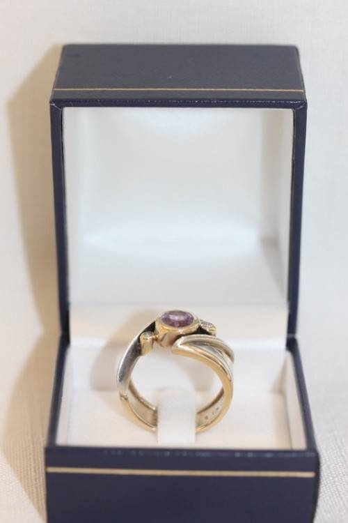 This beautiful 14ct yellow gold and sterling silver ladies ring with three diamonds and a large Amethyst stone is an incredibly stylish ladies ring. The two tone ring has gorgeous clean lines making it a sophisticated and elegant ring without it being excessive. The ring is stamped 14ct. Two of the diamonds are 2mm across and the third is 3mm across with the Amethyst stone being a very decent 6mm across. The ring weighs 9.7g and is a size "P" ring. Please view the pics carefully to fully appreciate this beautiful 14ct gold ring and to confirm the condition.