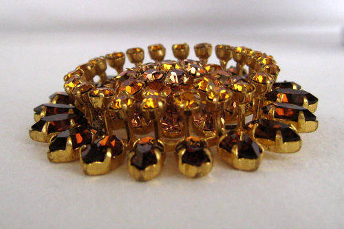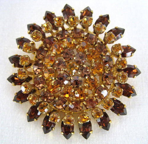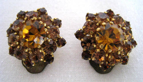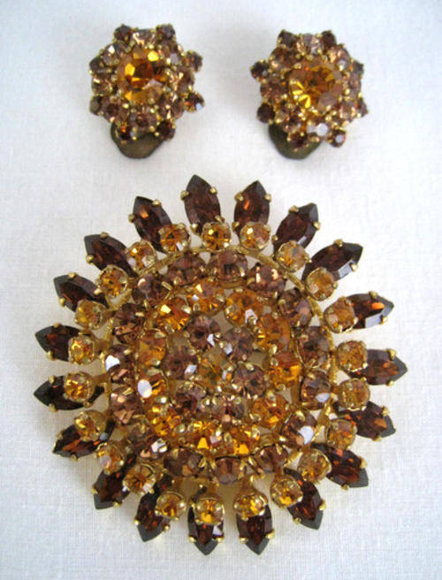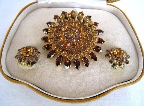 A 1960's Gold Tone Amber & Brown Coloured Rhinestone Brooch & Earring Set in original case