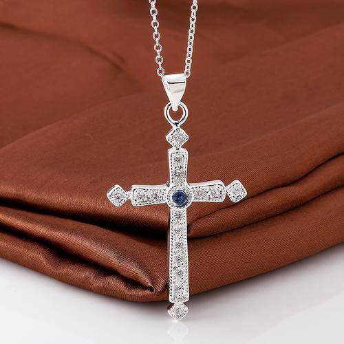 A Beautiful 925 Silver Plated Large Crystal Cross Pendant Necklace with a blue crystal center stone
