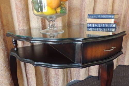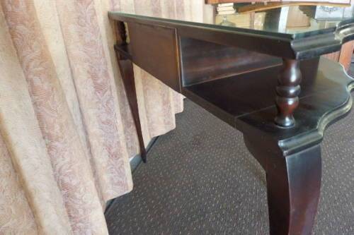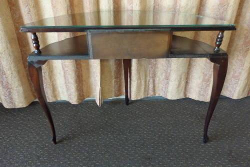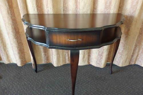 THIS BEAUTIFUL AND VERY ELEGANT VINTAGE QUEEN ANNE "HALF MOON" TABLE WITH LOVELY DETAILING AROUND THE FRONT OF THE TABLE IS PERFECT FOR AN ENTRANCE HALL OR ANY LIVING ROOM WHERE YOU NEED THAT SPECIAL PIECE. THE TABLE FEATURES A LOVELY REMOVABLE GLASS TOP AND IS THE PERFECT DISPLAY TABLE FOR A FEATURE PIECE OR LAMP ETC. THE TABLE ALSO HAS A SINGLE DRAWER TO STORE SOMETHING SMALL LIKE BOOKS OR MAGAZINES IN. THE TABLE MEASURES 95cm LONG x 47cm WIDE x 73,5cm HIGH. THE TABLE IS CLASSY AND A DEFINITE EYE-CATCHER. PLEASE VIEW THE PICS CAREFULLY TO FULLY APPRECIATE THIS GORGEOUS TABLE AND TO CONFIRM THE CONDITION.