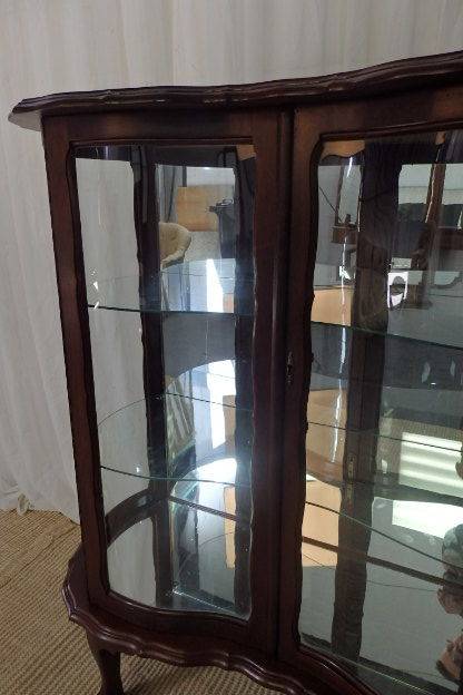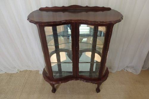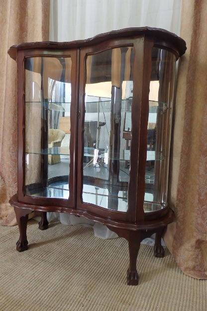 THIS BEAUTIFUL AND VERY ELEGANT ANTIQUE SOLID IMBUIA BALL AND CLAW SHOWCASE IS IN FABULOUS CONDITION FOR ITS AGE AND HAS ABSOLUTE MINIMAL AGE AND USAGE RELATED WEAR AND TEAR. THE CABINET HAS WONDERFUL DETAILING AND HAS CURVED GLASS PANELS. THIS IS MAGNIFICENT ANTIQUE FURNITURE. YOU DO NOT OFTEN FIND THESE SHOWCASES WITH ALL THE CURVED GLASS PANELS STILL INTACT. THIS BEAUTIFUL SHOWCASE WOULD LOOK ABSOLUTELY FABULOUS IN AN ENTRANCE HALLWAY, STUDY OR PERHAPS IN AN EXECUTIVE OFFICE FOR YOUR VALUABLE COLLECTIBLES. THE CABINET IS A REALLY BEAUTIFUL COLLECTOR PIECE!!! THE SIZE OF THE CABINET IS APPROXIMATELY 1040mm LONG x 415mm WIDE x 1240mm HIGH. THERE IS NO KEY FOR THE DOOR.