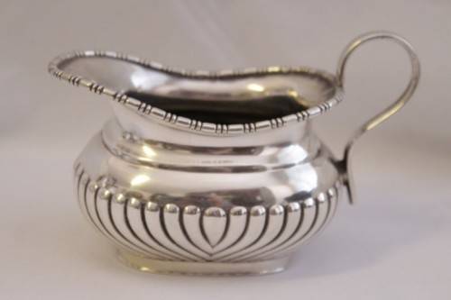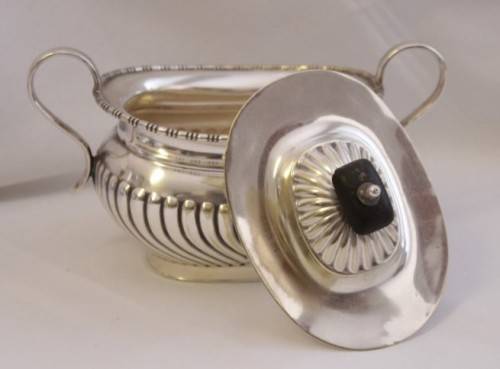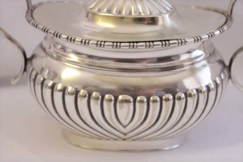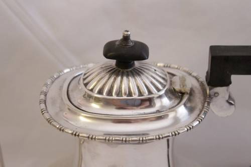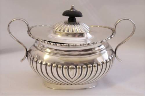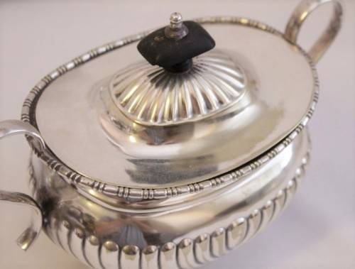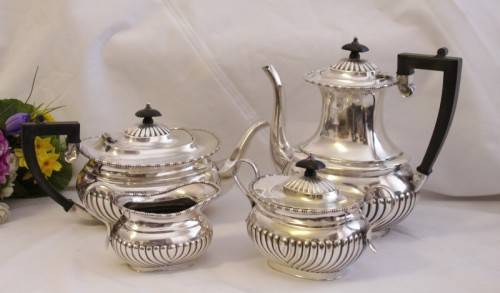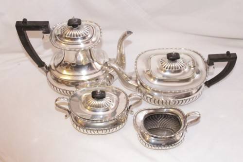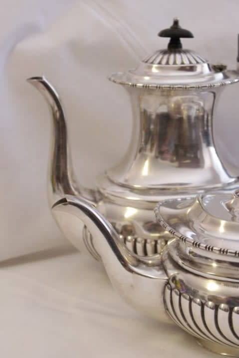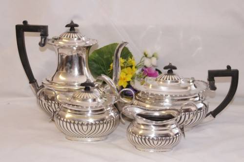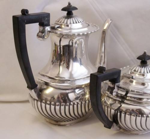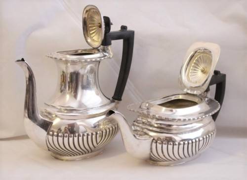This beautiful and ornate antique Art Deco EPNS silver plated tea service with stylish black Bakelite handles and lid knobs includes a good size 6-cup teapot, a 6-cup coffee pot, a lidded double handle sugar bowl and a creamer/ milk jug. The set is in lovely condition for its age and has minor/ normal age and usage related wear and tear and tarnish (see pics). The teapot measures 30.8cm long (spout to handle) x 14cm wide x 14cm high, the coffee pot is 25cm long (spout to handle) x 11.5cm wide x 22.5cm high, the milk jug is 14.5cm long (spout to handle) x 8.5cm wide x 9.5cm high and the sugar bowl is 19.3cm long (handle to handle) x 10cm wide x 12cm high. The teapot and the milk jug have usage related discolouration on the inside. Please view the pics carefully to fully appreciate this stunning antique silver plated tea service and to confirm the condition.
